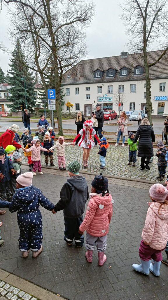Bevor der Bürgermeister, Klaus Rocher, uns den Schlüssel des Rathauses übergab, und damit symbolisch dem Karneval die „Regierungsgeschäfte“ übertrug, durften wir noch einige Kinder einer Rangsdorfer Kita mit Musik und Süßigkeiten erfreuen.